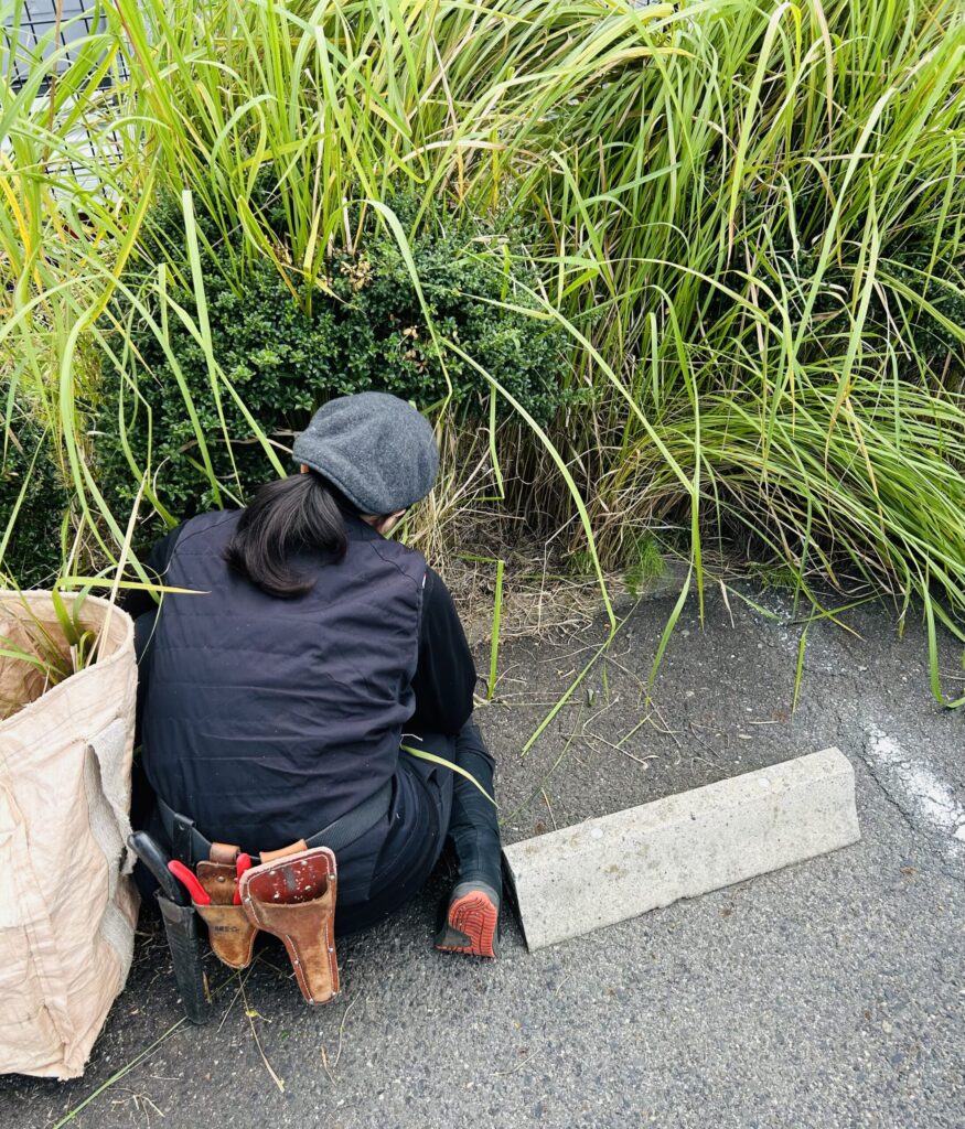チガヤの刈り取り 2025 10/28 雑草対策 本日は滋賀県でのご依頼でした。 チガヤは地下茎で広がりますので 根絶が非常に困難です。 根気よく伸びた葉を刈り取り 光合成ができないようにすることが重要です。 雑草対策 カポックの剪定