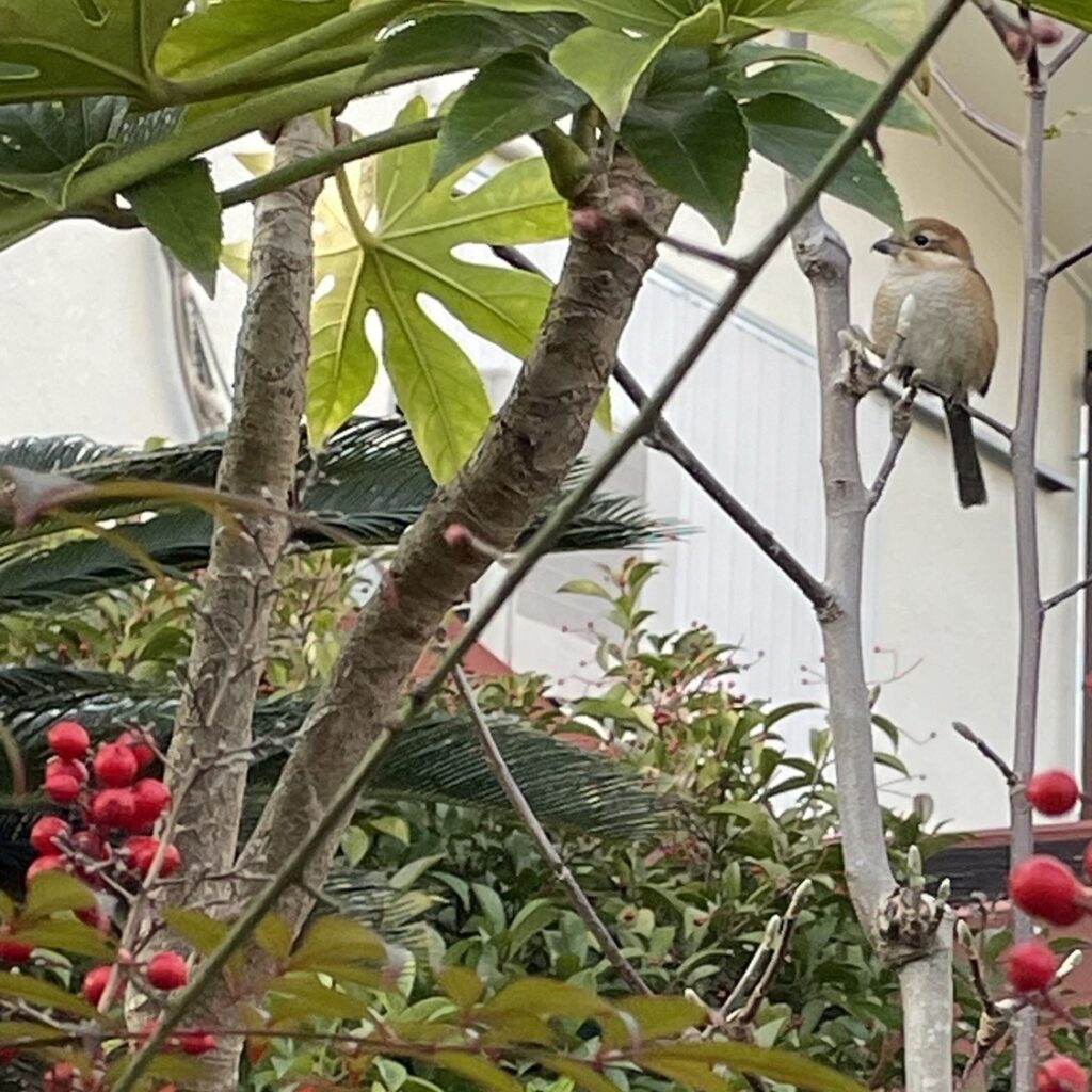 鳥が来る庭はいいですねぇ。 適度に透かし剪定をしますと鳥は中に入ることができますので 枝に留まりやすいのかな思います。 -